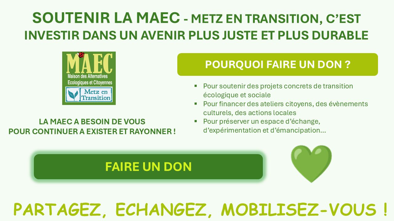 La MAEC est heureuse de vous présenter son site internet metzentransition.fr, tiers-lieu numérique et collaboratif qui permettra de mettre en synergie tous les acteurs de la transition écologique (citoyens, associations, collectifs, mouvements, AMAP, SCOP…) sur le territoire messin.