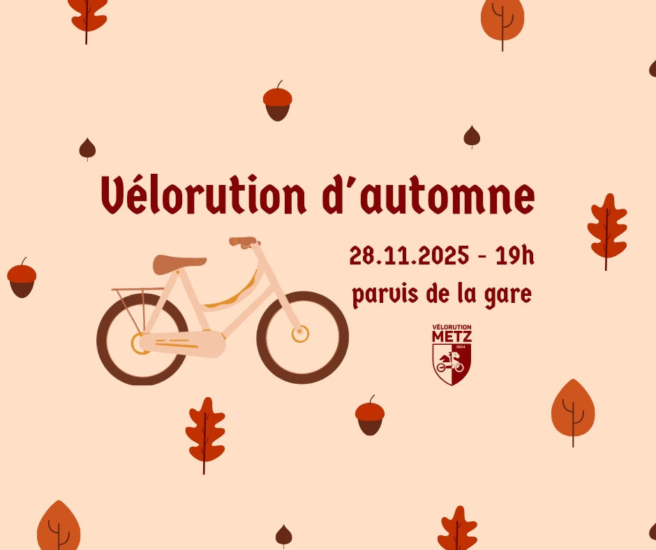 Parvis de la gare de Metz 1 place général de Gaulle, MetzSalut les vélorutionnaires, On se donne rdv ce vendredi 28 novembre à 19h sur le parvis de la gare de Metz l'avant dernière vélorution de l'année ! Soyons nombreux.ses pour montrer que le vélo à sa place en ville, avec bienveillance et bonne humeur toujours. N'oubliez pas vos lumières et gilets !