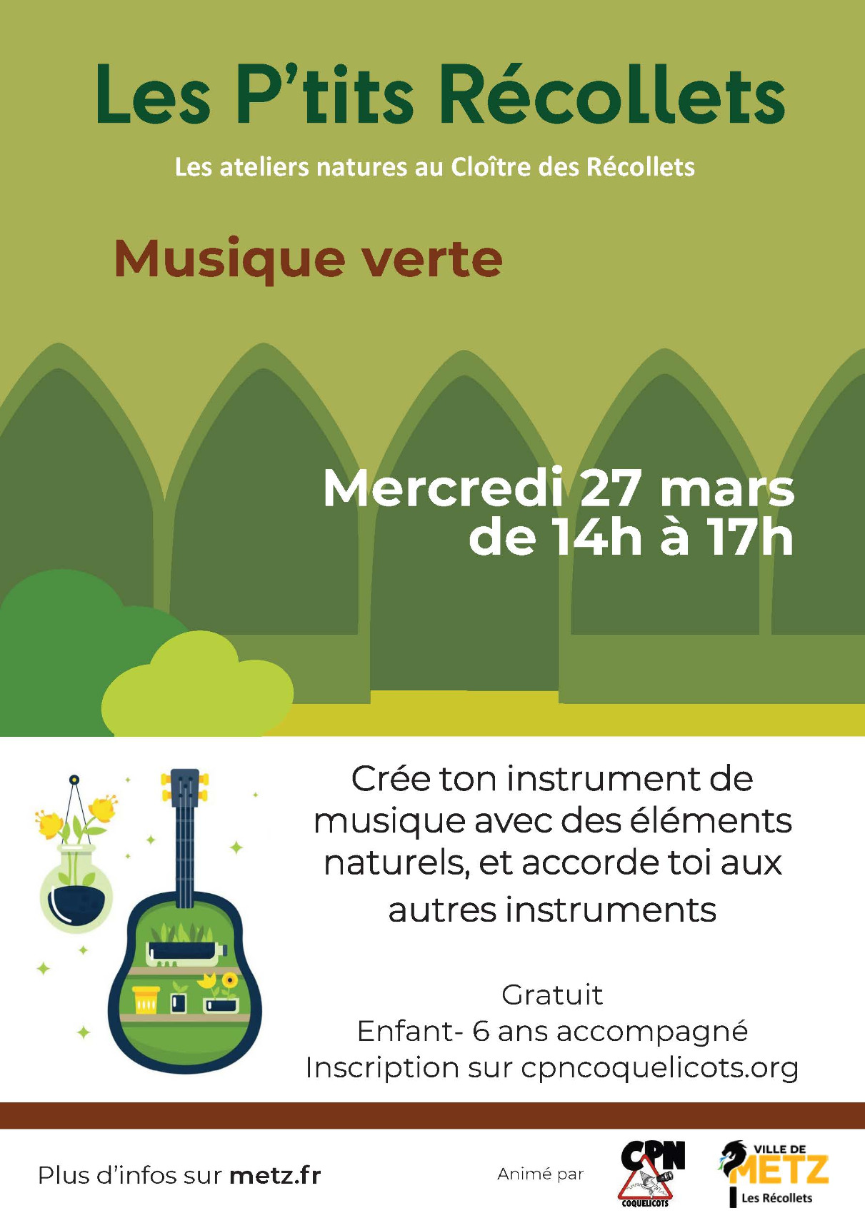 Cloître des Récollets 1 Rue des Récollets, Metz, FranceLes mercredis de 14h à 17h en période scolaire. Jeux, créations, explorations ludico-naturalistes. Inscription sur cpncoquelicots.org Pour plus d'informations contactez Guillaume : 07.58.88.70.15