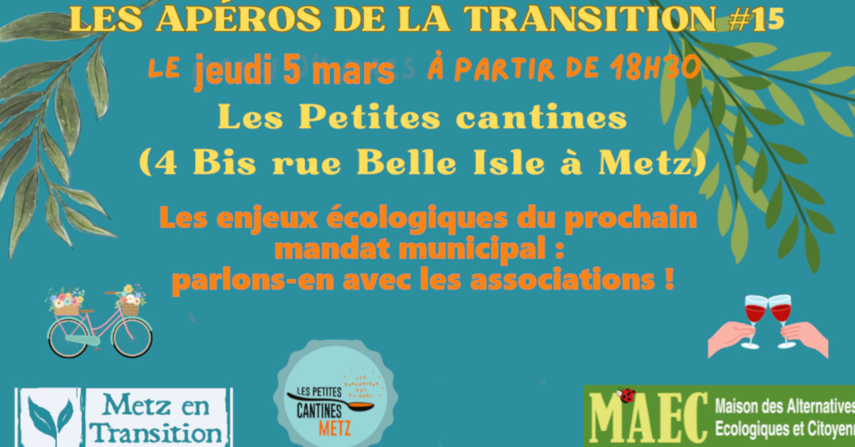 Les petites cantines 4A Rue Belle-Isle, MetzApéro pour la transitionJeudi 5 mars aux petites cantineThème :Les enjeux écologiques du prochain mandat municipal : parlons-en avec les associations ! Les apéros pour la transition sont un moment d'échanges pour les acteurs de la transition écologique, sociale et citoyenne animé par la MAEC - Metz en transition. Tout le monde est invité, associations, […]