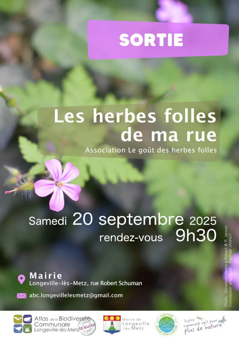 La Mairie de Longeville-Les-Metz vous propose, une sortie sur le thème « les herbes folles de nos rues ». Animée par l’association Le gout des herbes folles, cette sortie nous permettra de porter un autre regard sur les plantes qui poussent en milieu urbain, le long des murs ou des murets, ou encore en limite des trottoirs. A noter dans vos agendas le samedi 20 septembre avec un départ à 9h30.